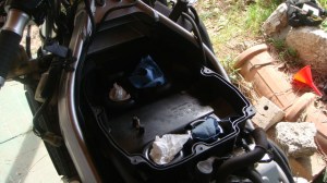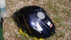 E’ arrivato cosi il momento della rimozione del serbatoio. Ho cosi provveduto al tipico succhio per svuotarlo con tanto di tubo come ai vecchi tempi dei motorini. Dopo aver bevuto circa 2 litri di benzina ed respirato quel fetore che mi causera’ una morte prematura nel giro di pochi giorni…..(sgrat sgrat) l’ho svuotato quasi completamente.