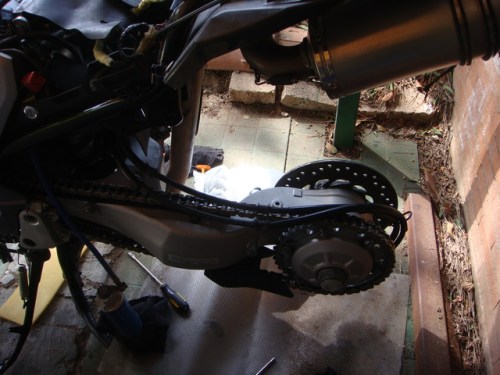 Dopo avere effettuato queste operazioni estetiche ho rimesso la moto nel suo posto di lavorazione ed ho rimosso la ruota posteriore al fine di lavorare sul monobraccio e la trasmissione finale della moto.