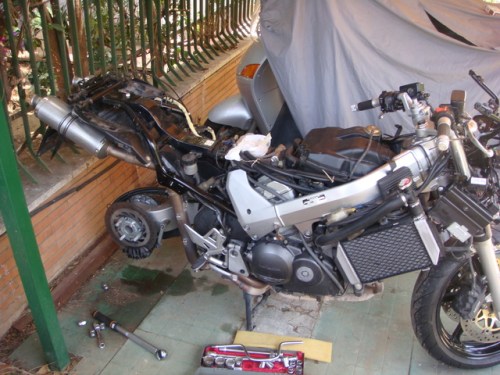 Una volta montata la ruota anteriore ed il cavalletto laterale ho deciso di spostare la moto in un punto con piu luce e piu comodo per le lavorazioni.